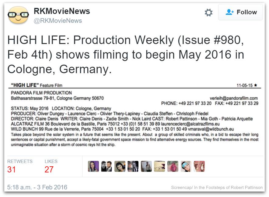Según PRODUCTION WEKLY, la película ´´High Life ´´ de Claire Denis se comenzará a filmar en Mayo de 2016 y menciona Colonia Alemania como lugar de rodaje.